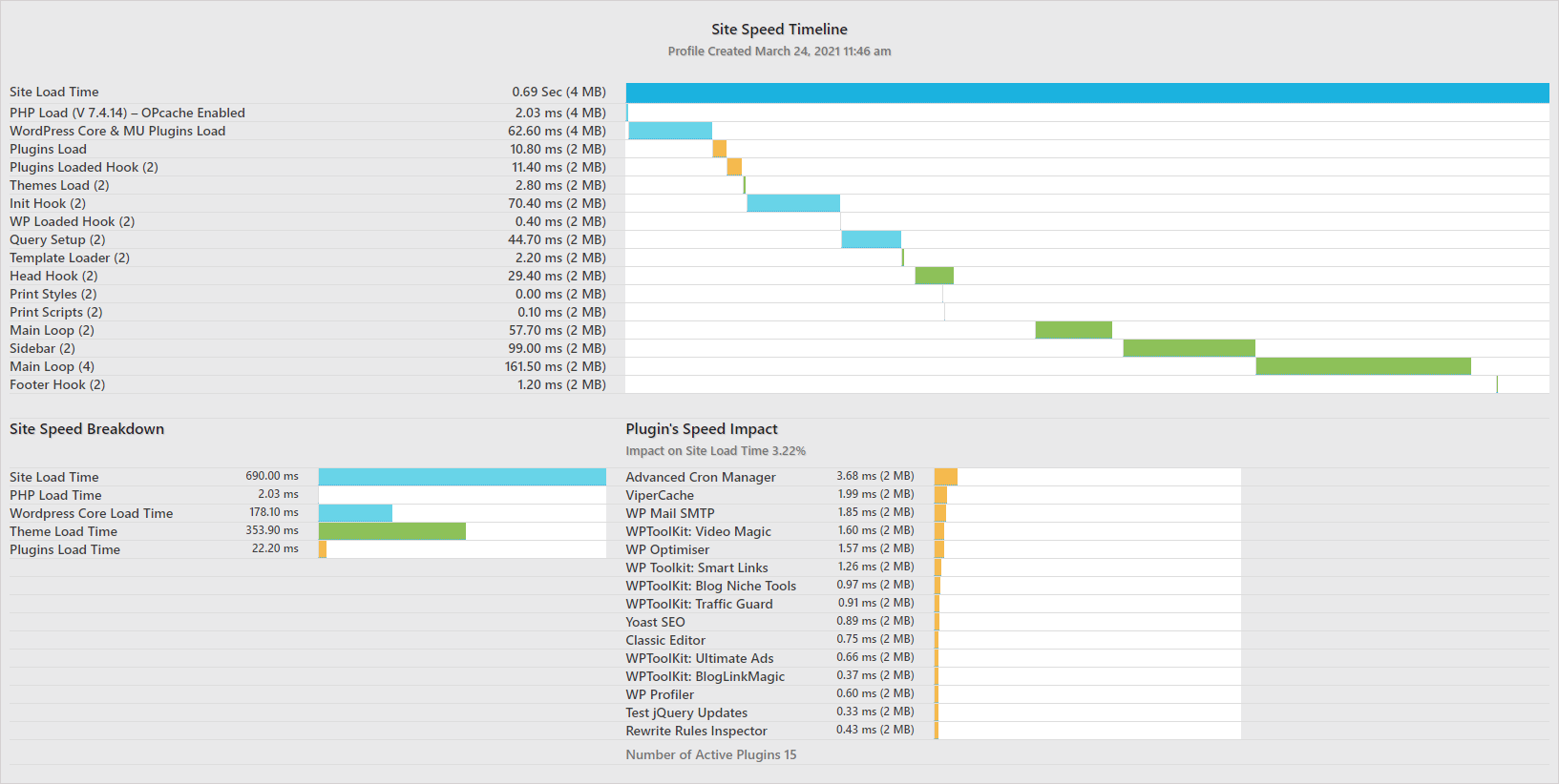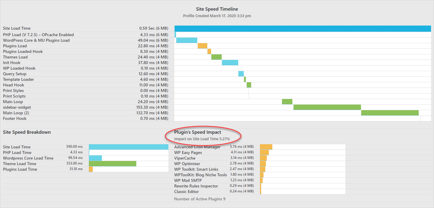 Simply run WP Profiler and you’ll get a detailed report quickly showing you all potential issues currently slowing down your blog.